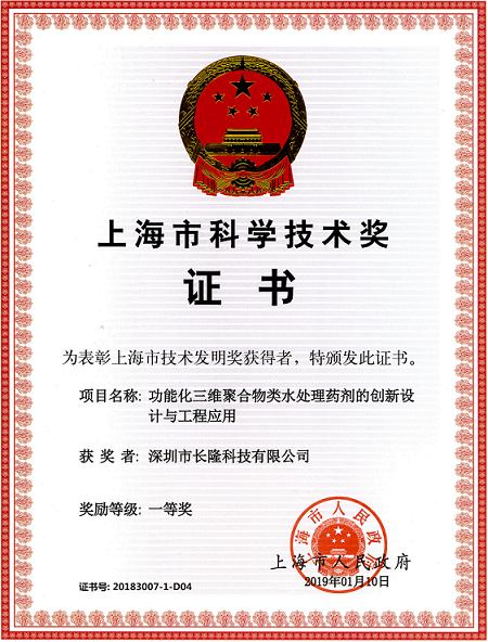 熱烈祝賀深圳市長隆科技有限公司與同濟大學等院校和企業共同合作的項目《功能化三維聚合物類水處理藥劑創新設計與工程應用》榮獲2018年度上海市技術發明一等獎。
