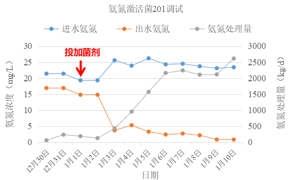 庫(kù)巴魯氨氮激活菌201投加3日后出水氨氮開始降低,系統(tǒng)硝化能力明顯好轉(zhuǎn)